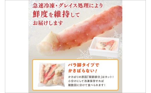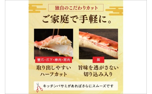 蟹爪と爪下、棒肉、肩肉については、ハーフカットしてお届けします。冷凍庫に入れやすいバラ脚タイプなので保管しやすく解凍後は殻をむきそのままお召し上がりいただけます。