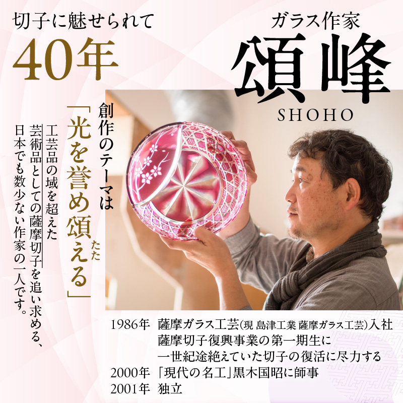 ガラス作家 頌峰は、古薩摩切子を源流に、伝統を超えた独自の感性で新しいガラスの美しさを表現しています。