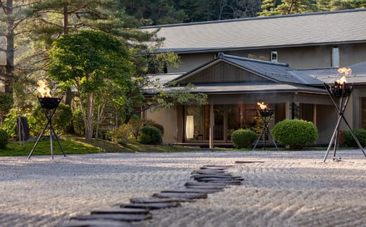 かがり火が焚かれる白砂の中庭を取り囲む形で、自然との調和を重んじる新数奇屋造りの客室が並んでいます。