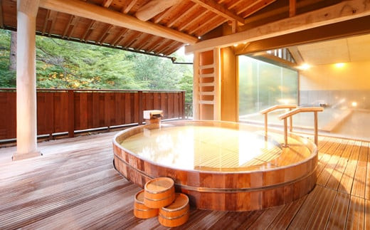 大きな窓を開放して楽しめるひのきの半露天風呂では、誰にも気兼ねすることなく、ゆったりと自家源泉の温もりをご堪能いただけます。