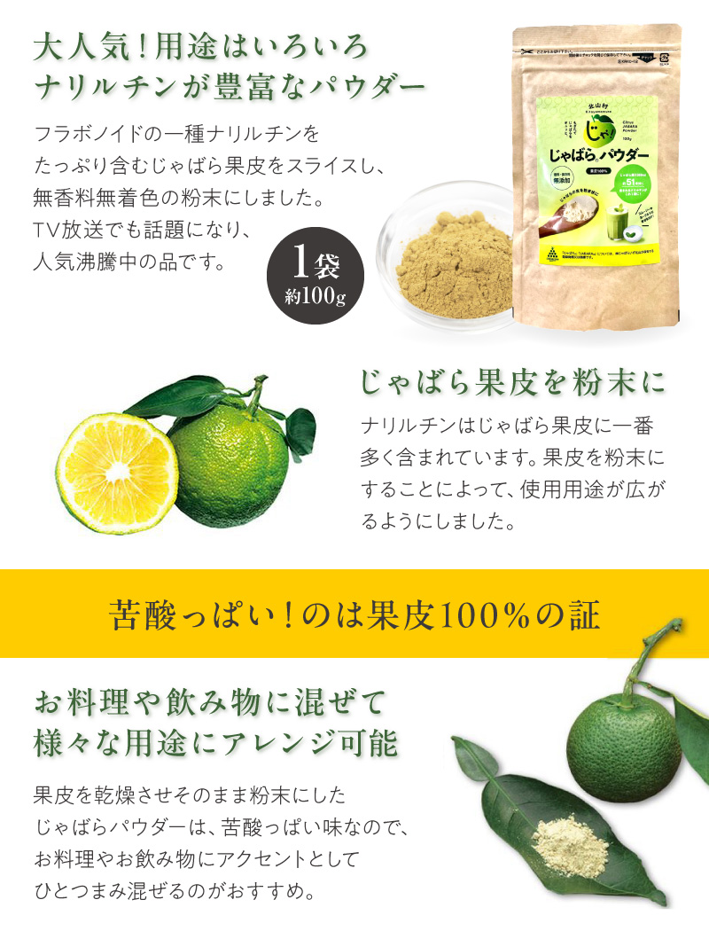 ナリルチンはじゃばら果皮に一番多く含まれています。果皮を粉末にすることによって使用用途の幅が広がるようにしました。苦酸っぱいのは果皮100%の証です。