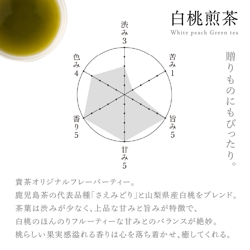 鹿児島茶の代表品種「さえみどり」と山梨県産白桃をブレンド。