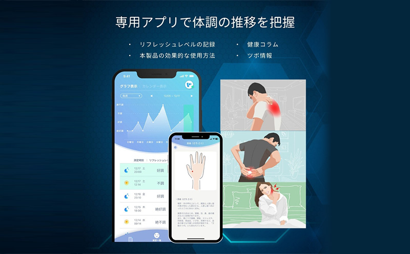 ・専用アプリにで体調の推移を把握リフレッシュレベルの記録健康コラム本製品の効果的使用方法ツボ情報など