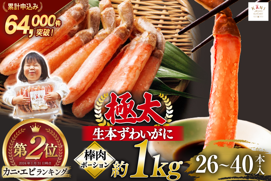 ![極太 生本ずわいがに 棒肉 ポーション 約1kg 26本〜40本入り 殻剥き不要 ! 脚肉のみ ! [カネダイ 宮城県 気仙沼市 20564335] 蟹 かに カニ ずわいがに ズワイガニ ずわい蟹 ズワイ蟹 カニ脚 蟹脚 カニ棒肉](https://www.furusato.aeon.co.jp/g_img/042056/file_6aeb9d7efd32bd59b6e47fa50c7298df.webp)