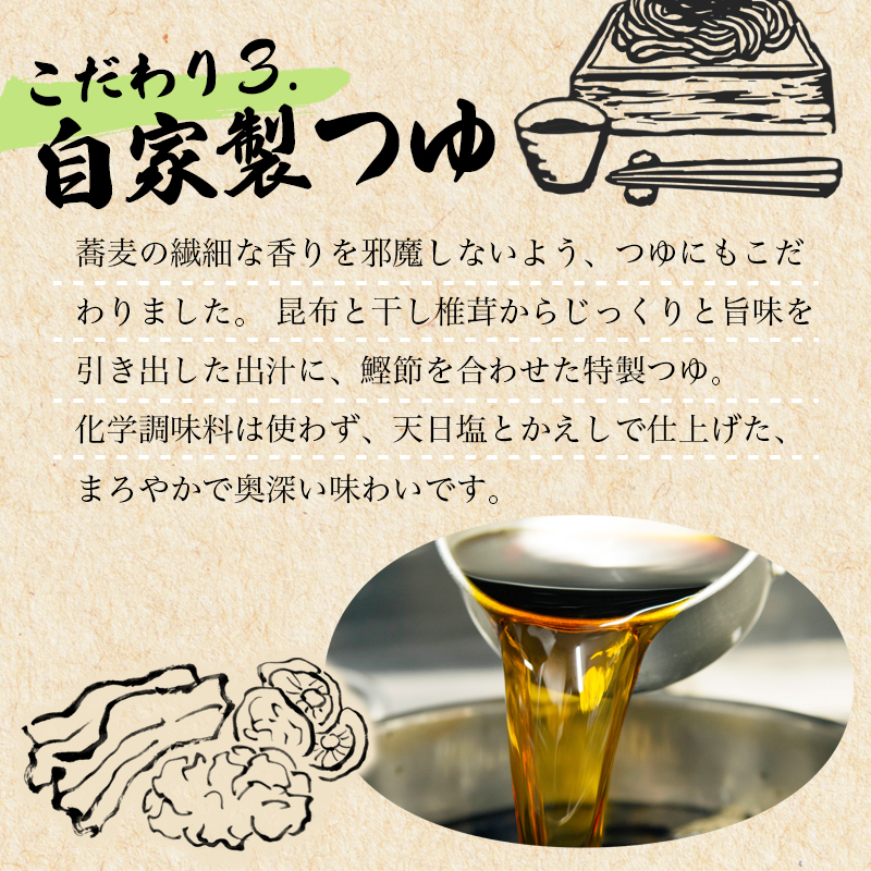 ・そば(蕎麦福井・小麦熊本) ・特製つゆ(醤油・天日塩・昆布・干し椎茸・鰹節)、みりん
