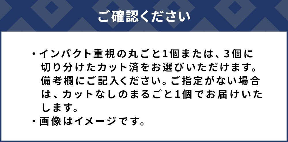 ・インパクト重視の丸ごと1個または、3個に切り分けたカット済をお選びいただけます。備考欄にご記入ください。ご指定がない場合は、カットなしのまるごと1個でお届けいたします。