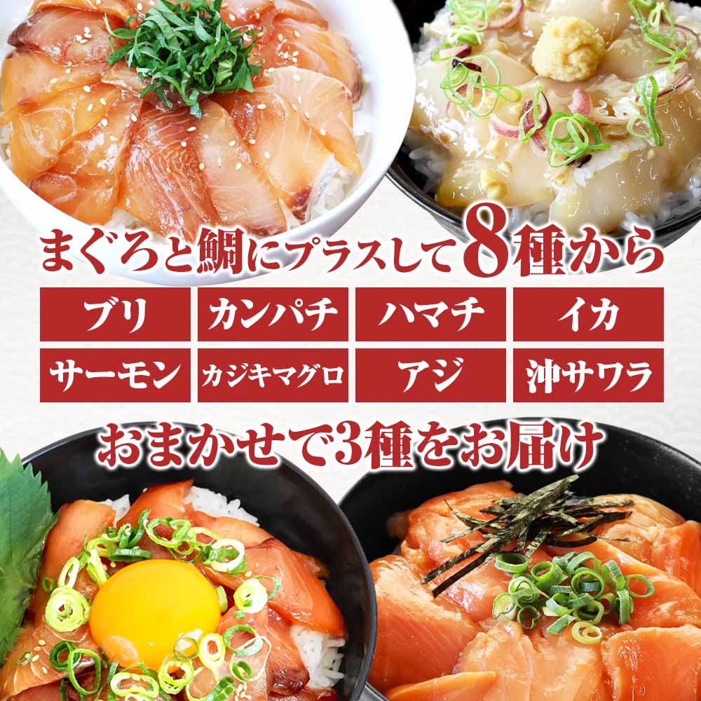 マグロと鯛の他は、ブリ・カンパチ・ハマチ・イカ・サーモン・カジキマグロ・アジ・沖サワラからランダムで3種を選んでお届けします。