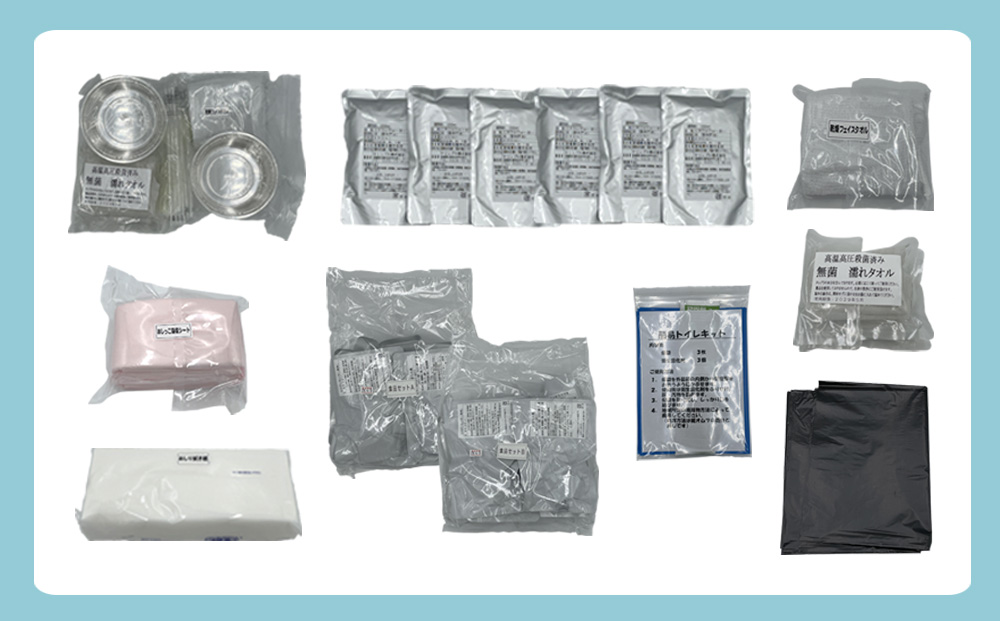■食料品(調理済)12種×15食 ・じゃがいも(バター風味)×2袋 ・かぼちゃ煮×2袋 ・さつま芋の甘煮×2袋 ・ミートボールのトマトソース煮×1袋 ・中華風ミートボール煮×1袋 ・肉じゃが×1袋 ・軟骨チャーシュー×1袋 ・さばのみそ煮×1袋 ・ししゃも焼 5尾×1袋 ・さつま揚げと大根の煮物×1袋 ・大豆と根野菜のトマトソース煮×1袋 ・筑前煮×1袋 ■飲料水 200ml×6袋 ■衛生用品 ・無菌濡れタオル大判×2枚 ・乾燥フェイスタオル大判×1枚 ■食事用容器 ・プラスチック容器×9個 ・先割れスプーン×9本 ・ストロー×6本 ■簡易トイレ(外箱使用) ・おしっこ吸水シート大判×3枚 ・ビニール袋×3枚