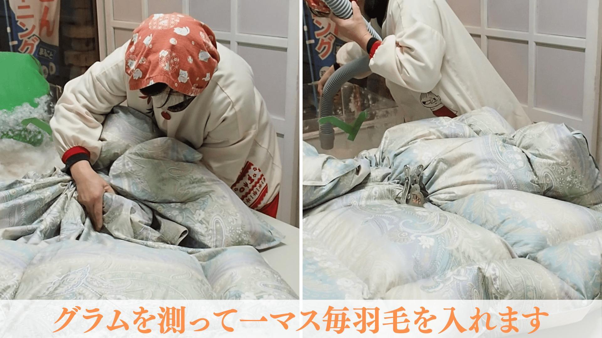 羽毛布団洗浄後、羽毛を取出しグラムを測り新しい生地に入れる。100g(台湾ホワイトダックダウン85)はサービスで入れます。縫製して出来上がりです
