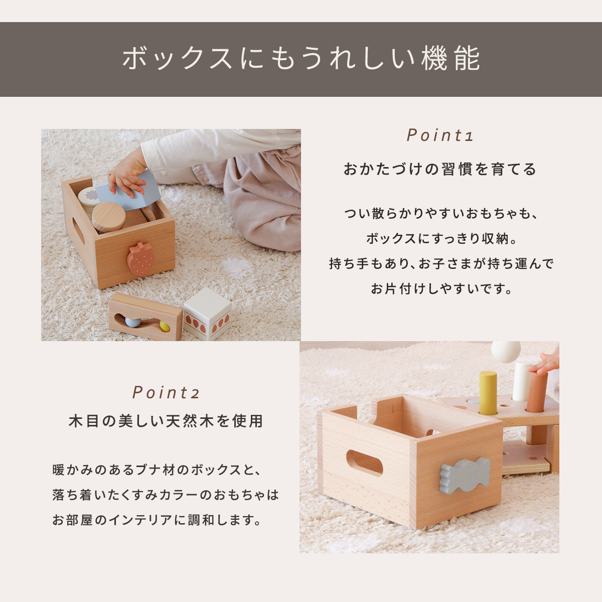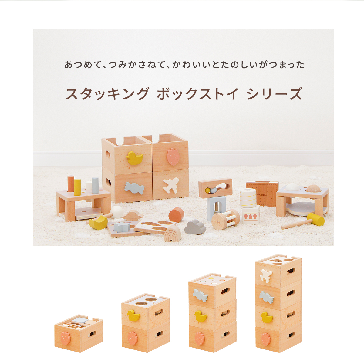 コンパクトなスタッキングボックスに入った年齢別で楽しめるおもちゃは、観察力・想像力・集中力を育みます。