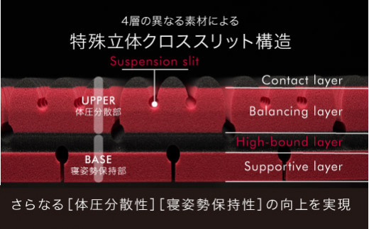 しなやかな新素材フレスフォームをトップ層に採用。新たな「サスペンションスリット」との相乗効果で、やさしい触感のより身体にフィットする寝心地に。