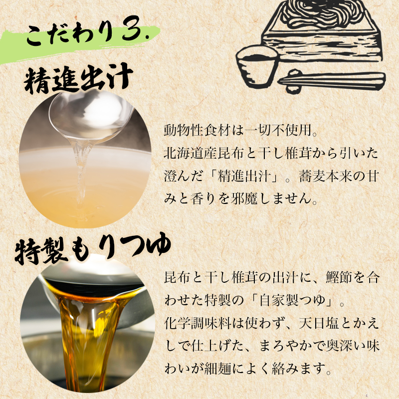「精進出汁そばセット」のこだわりは「香り」「喉越し」「出汁」の三点です。まず「香り」。お客様の注文後に福井県産の蕎麦の実を石臼で丁寧に挽き、すぐに手打ち・急速冷凍。ご家庭で茹でた瞬間に芳醇な香りが立ち上ります。次に「喉越し」。店主が受け継ぐ長野戸隠流の系譜に基づき、つるつるとした喉越しが特徴の細麺に仕上げています。最後に「出汁」。蕎麦の繊細な香りを活かすため、動物性食材を一切使わず、北海道産昆布と干し椎茸から引いた「精進出汁」を使用。澄んだ旨味が細麺と見事に絡み合います。