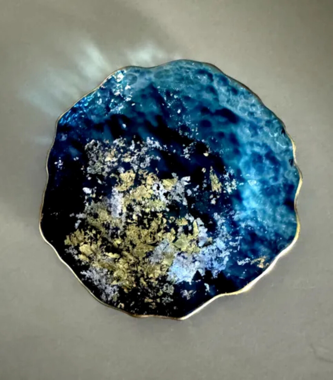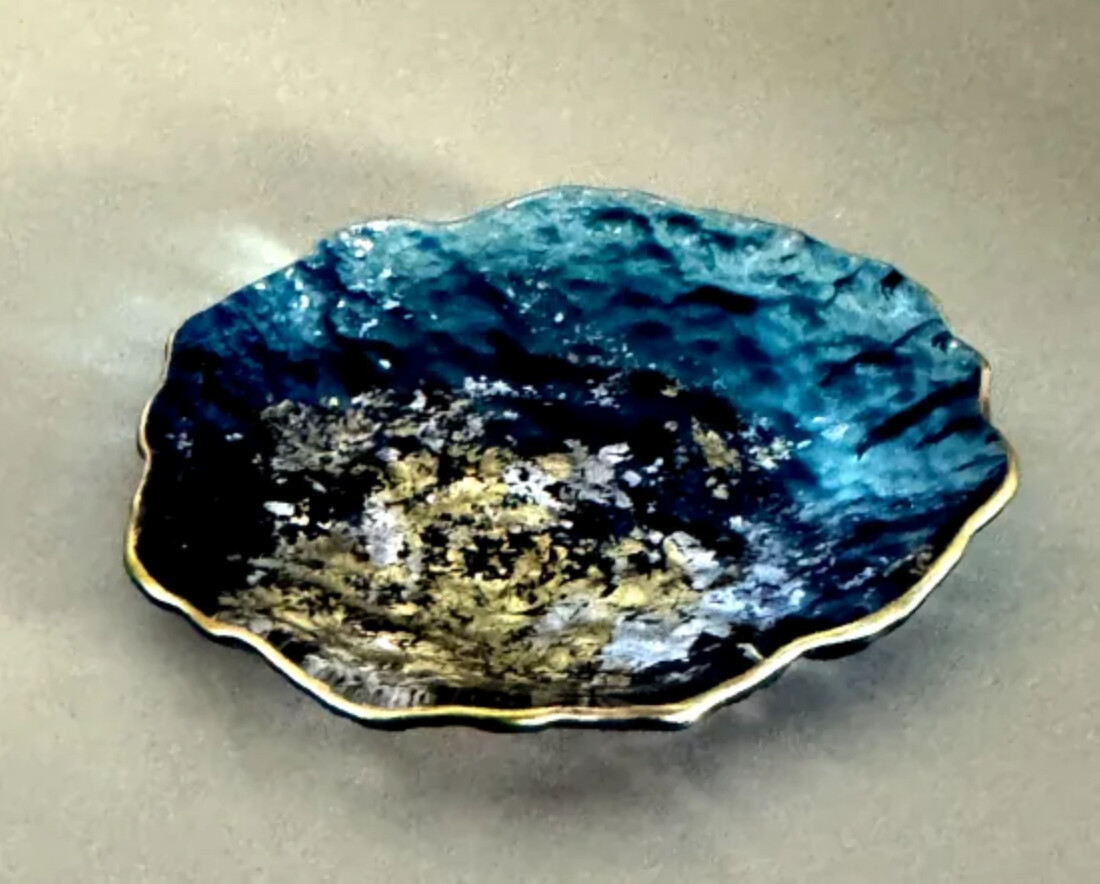 ガラスの裏面から漆を意匠していますので、表面はガラスであるため従来の漆器では使用不可能とされていたカトラリーの使用が可能な斬新なアイテムです。