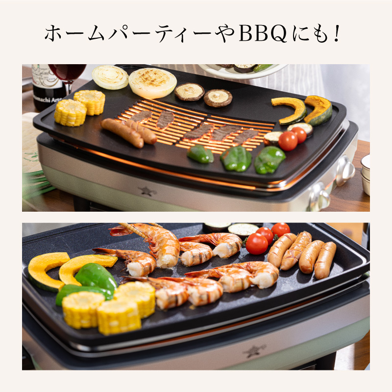 さらに、プレートの中央部には油を溜めるためのオイルポケットを配置。調理中に食材から出た余分な油は、中央の穴から下の水受け皿へと落ちる仕組みです。これにより、プレート上に油が溜まって焦げ付きや煙が発生するのを防ぎ、煙を大幅に軽減。お部屋のニオイを気にすることなく本格的な焼き肉やグリル料理を楽しめます。