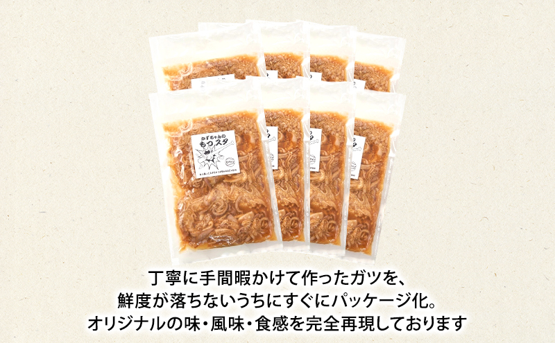 球場店舗でも大人気の『もつスタ』を商品化。国産の豚ガツを細切りにし、にんにく醤油に漬け込みました。