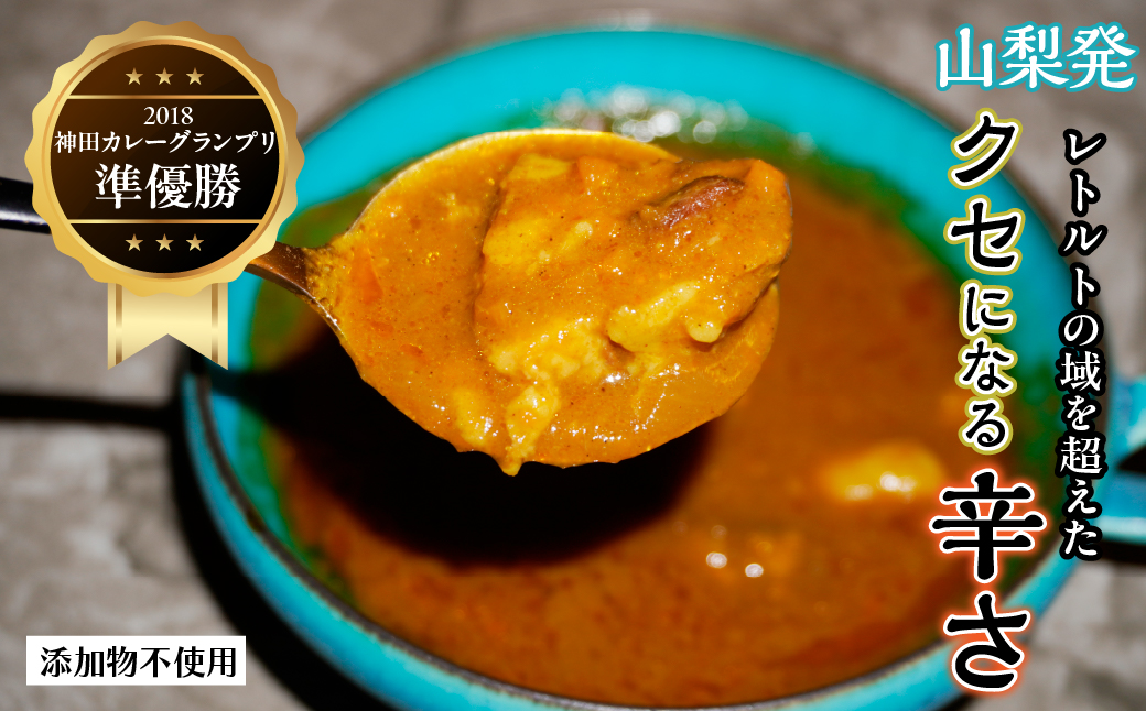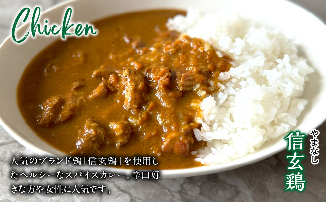 レトルトとは思えない本格スパイスカレーに山梨県ブランド鶏、信玄鶏ををたっぷり使用。