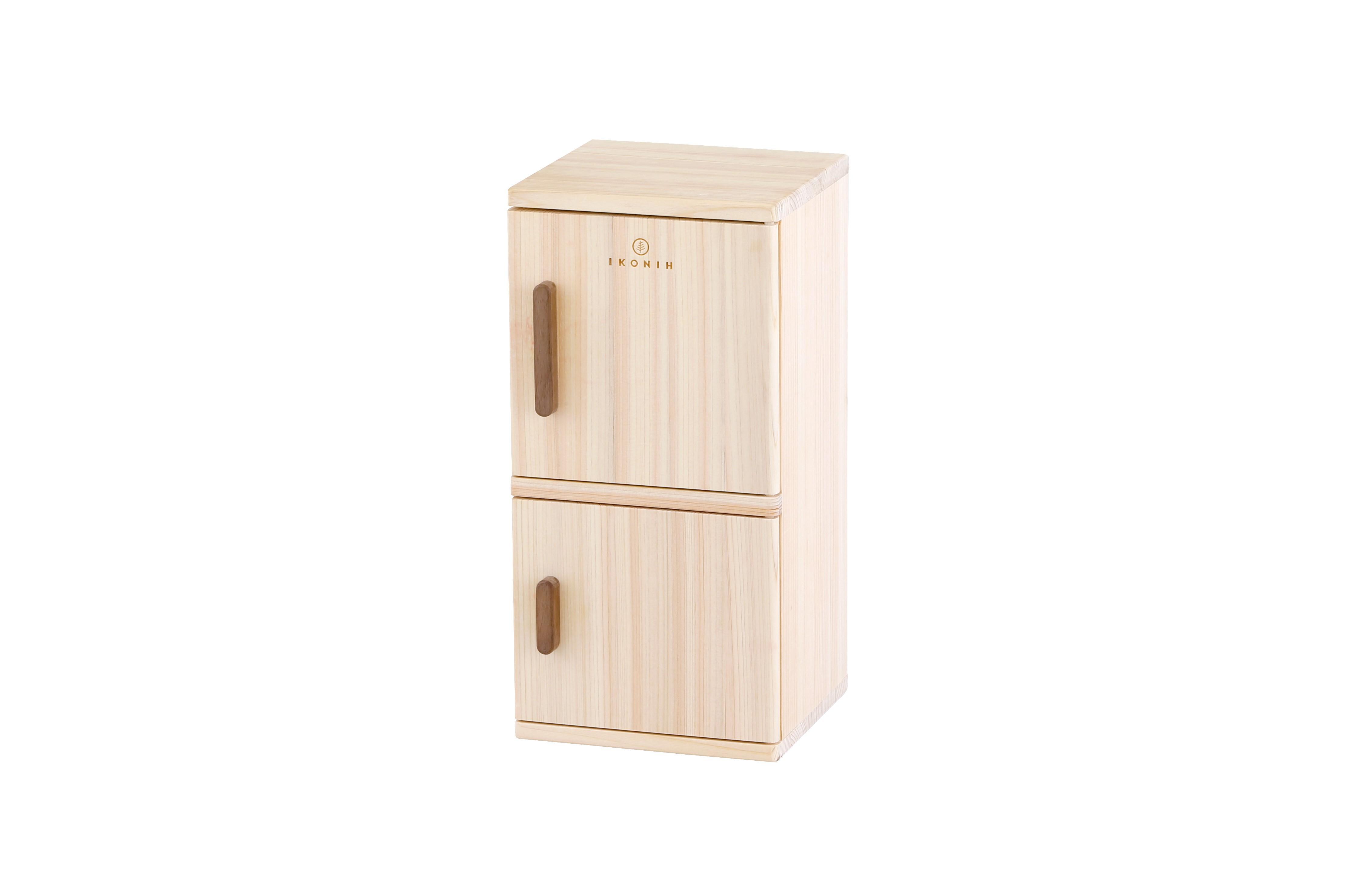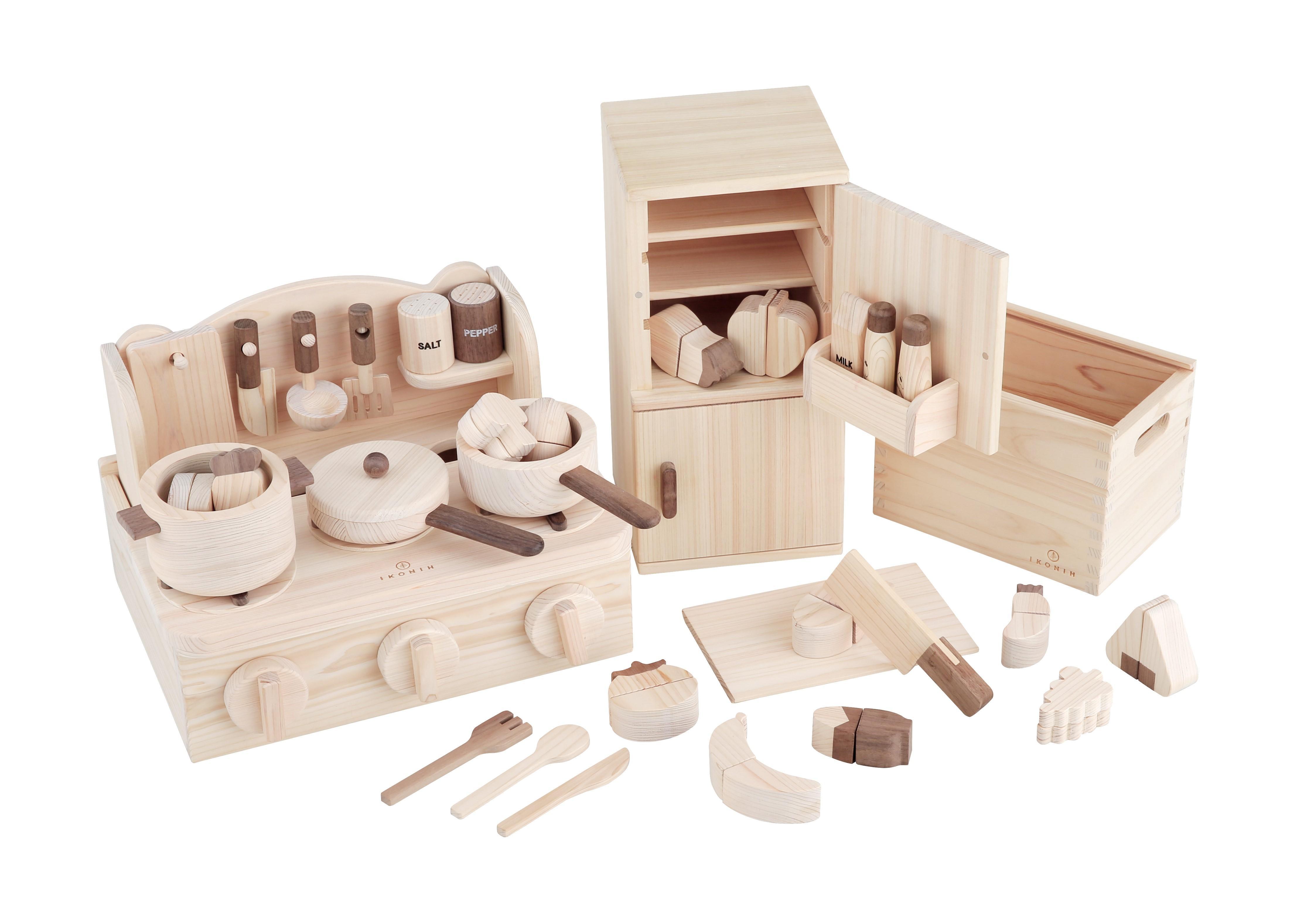 国産檜使用の食材セット、ままごと冷蔵庫、ミニキッチンの3点セット。