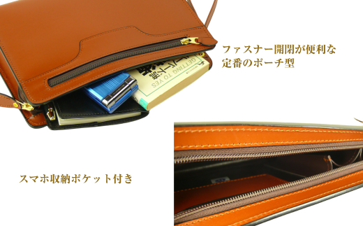 【返礼品仕様】ファスナー開閉式/ハンドストラップ(取り外し可能)/ファスナー付き外ポケット(前1)/カード入れ/携帯電話(スマートフォン)ポケット