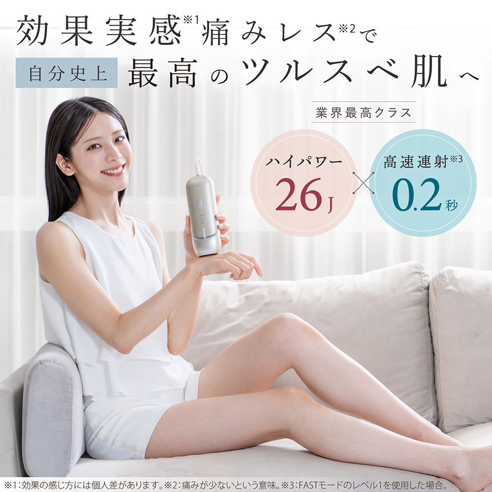 肌の冷却を行いながら光を照射する、痛みレスな光美容器です。サファイヤクリスタルによる冷却に加え、光を数回に分けて速く照射する技術により、痛みを最小限に抑えながら効果的にムダ毛に働きかけることができます。