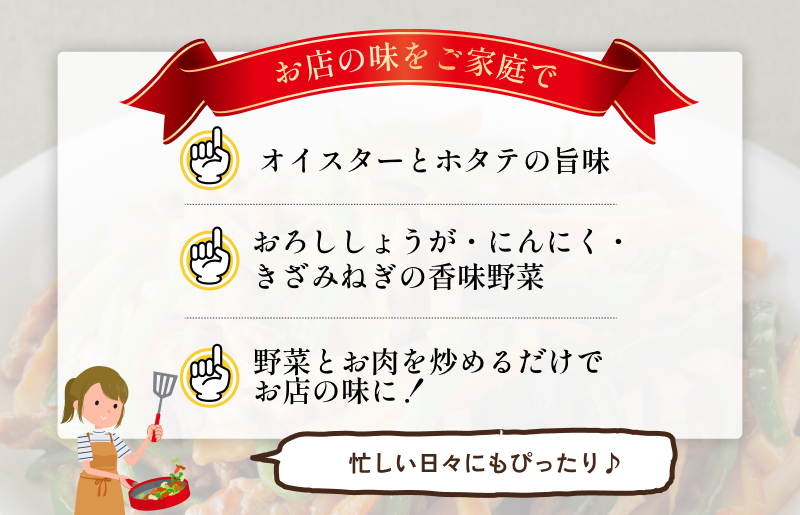 野菜とお肉を切って炒めるだけで、本格中華の味を手軽にご家庭でお召し上がりいただけます!