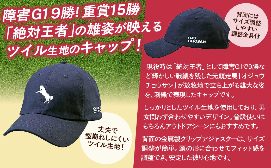 障害レース界の絶対王者「オジュウチョウサン」の放牧地で立つ雄大な姿が刺繍されたキャップです。