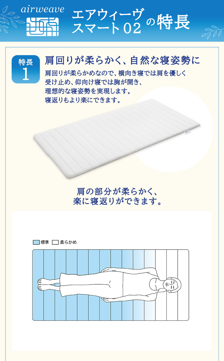 肩回りを柔らかくすることで、適度に肩が沈み込み理想的な寝姿勢を実現。よりスムーズな寝返りを打つことができます。