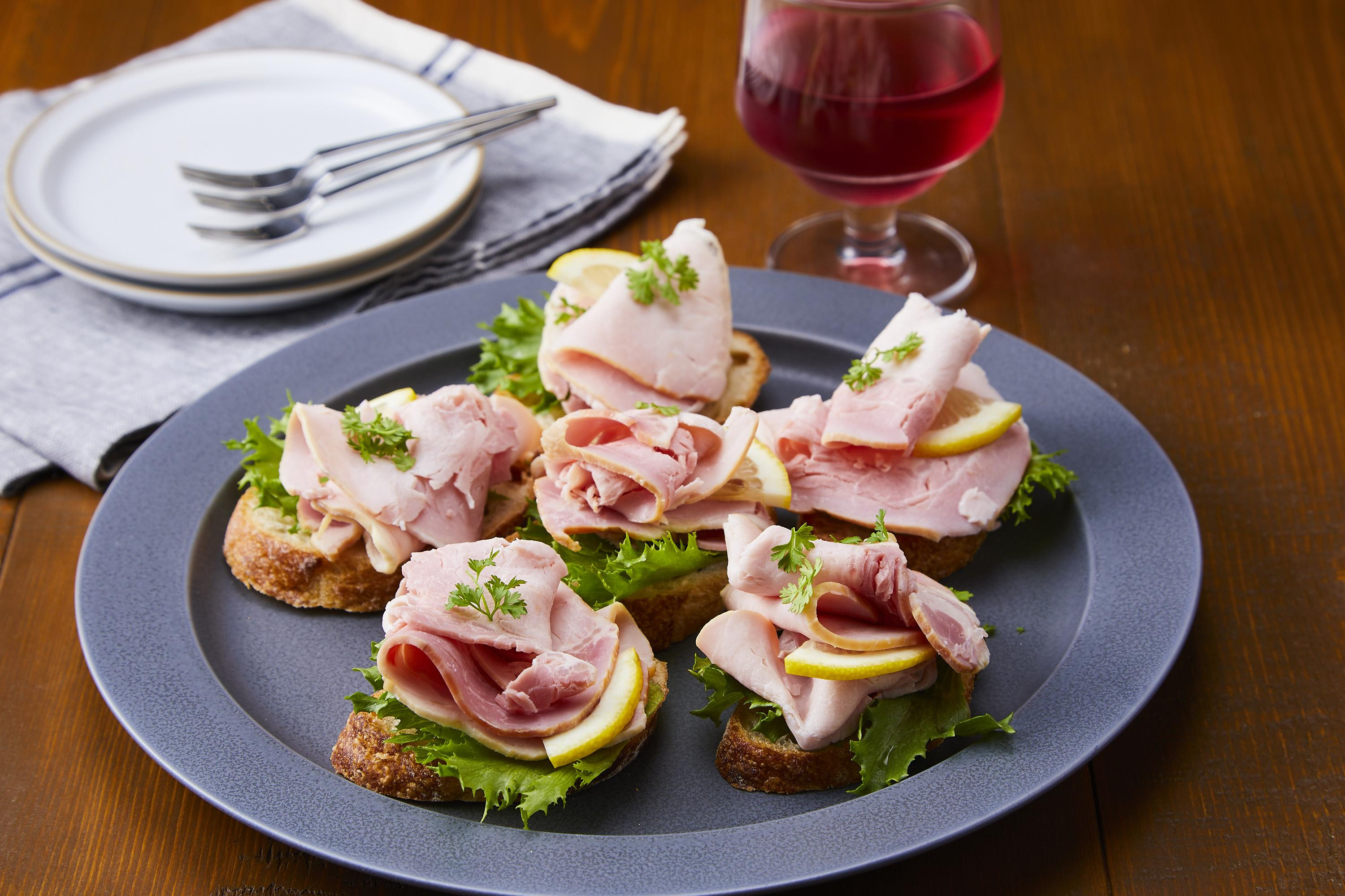 夢一喜人気のロースハムにスライスした玉ねぎをのせて、オリジナルのドレッシングを掛けて巻いて食べる。