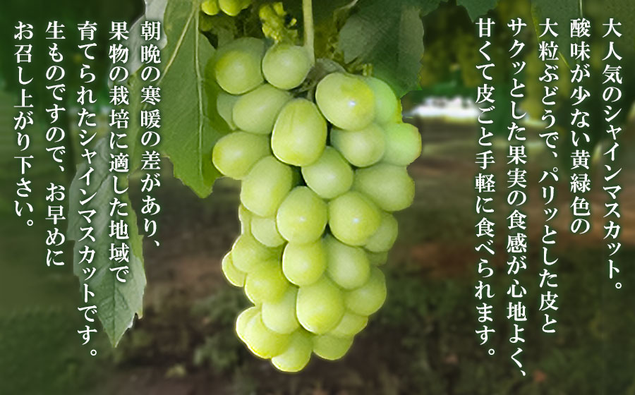 朝晩の寒暖の差があり、果物の栽培に適した地域で育てられたシャインマスカットです。