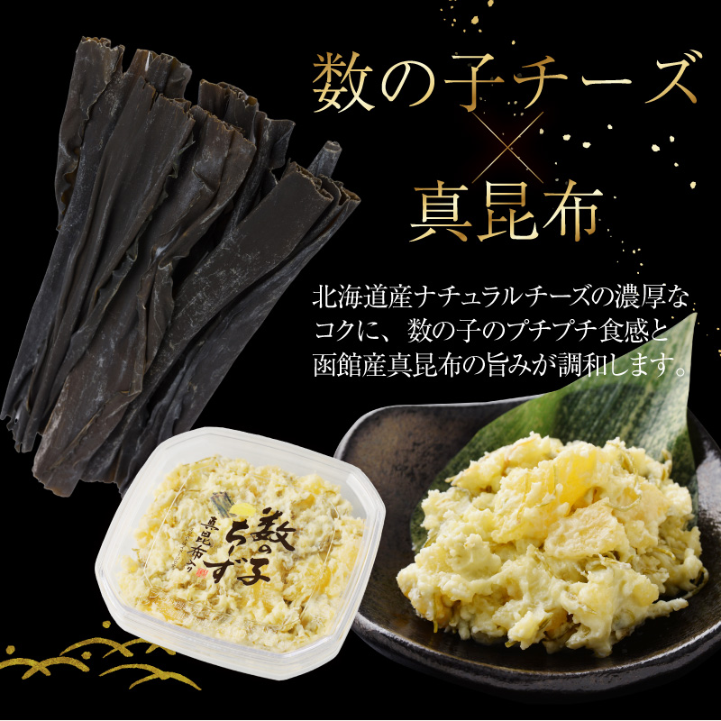 ナチュラルチーズ(北海道製造)、数の子、プロセスチーズ、昆布、昆布茶、醤油、発酵調味料、食塩/ソルビット、酒精、調味料(アミノ酸等)、乳化剤、甘味料(ステビア)、増粘多糖類、酸味料(一部に乳成分・小麦・大豆を含む)