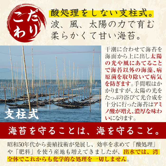 出水天恵海苔の海苔は、少し厚みがあり、サクッとバリっとしています。自然の恵みをたっぷり受け、海苔一枚の味にこだわる熟練の頑固職人が、海苔の持つ味を最大限に引き出し一枚の海苔が出来上がります。出水の海苔ならではの、香り、口当たり、余韻まで、まずはそのままお召し上がりください。