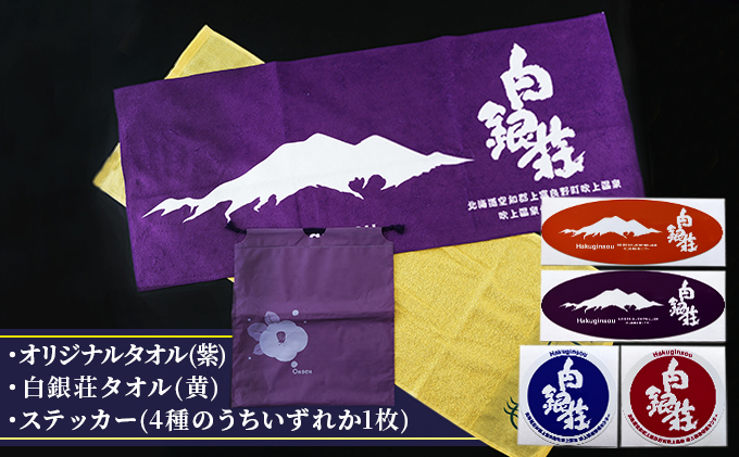 オリジナルタオル(紫) ×1 、 白銀荘タオル(黄) ×1 、ステッカー×1(4種のうちいずれか1枚)