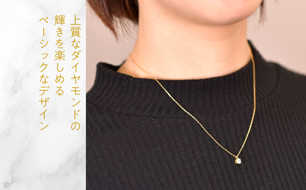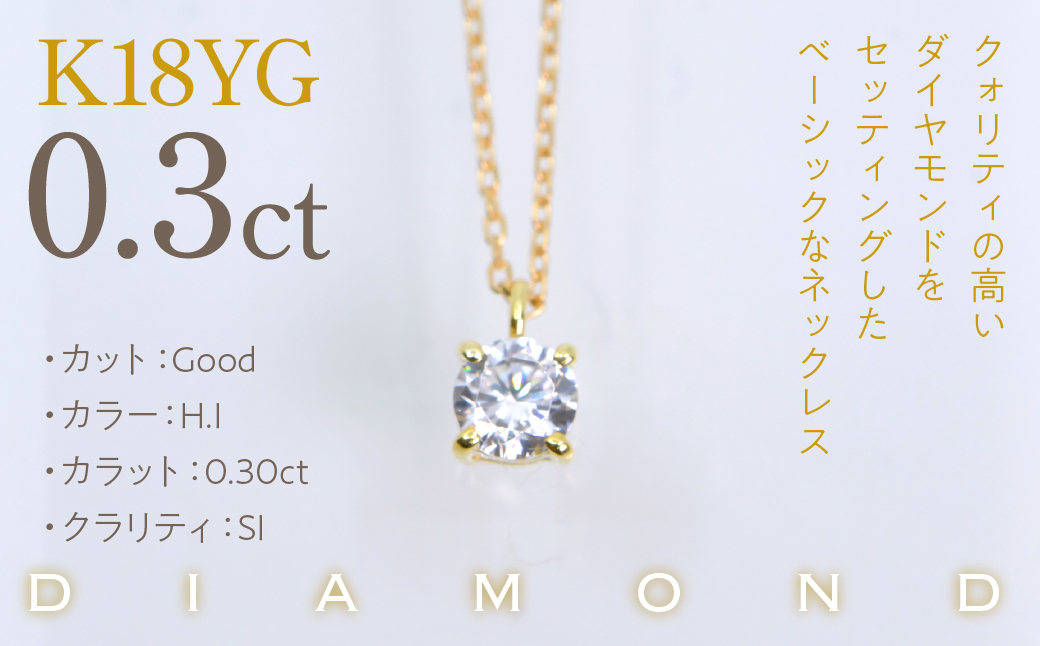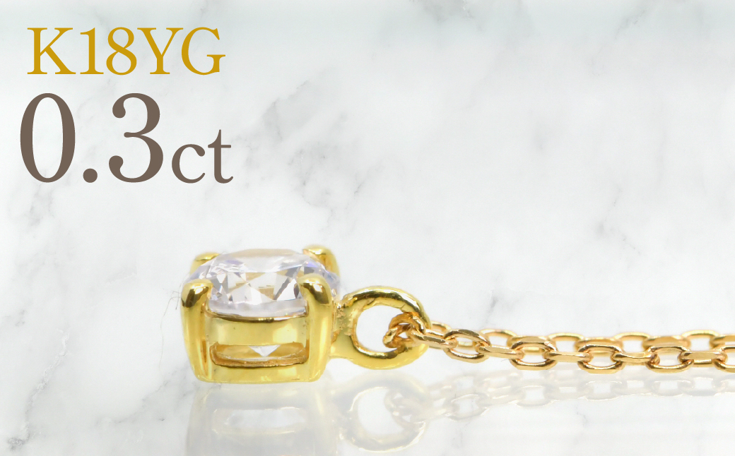 モダンな印象の4本ツメのシンプルデザインのネックレスです。K18イエローゴールドにH〜Iカラー/SIクラス/Goodのクォリティの0.3ctのダイヤモンドをセッティングしたクールな印象のデザインです。厳選された品質のダイヤモンドは動きに合わせて魅力的な輝きを放ちます。チェーンは45cmのフリーアジャスターをお付けしていますので自由に長さを調整して頂けます。毎日のファッションをステキに彩るアイテムです。いつも頑張っている自分へのご褒美にダイヤモンドをプレゼントしませんか。