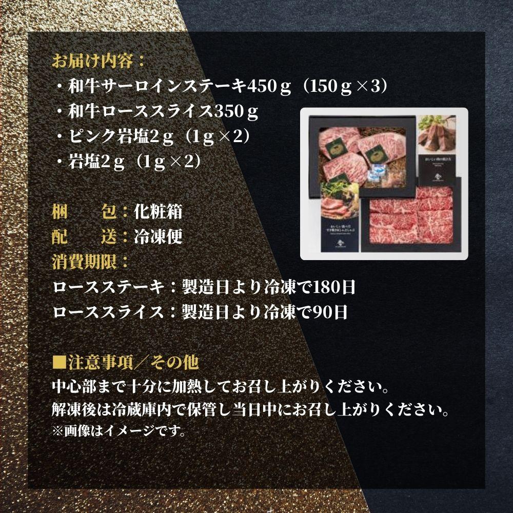 和牛サーロインステーキ450g(150g×3)、和牛ローススライス350g、ピンク岩塩2g(1g×2)、岩塩2g(1g×2)