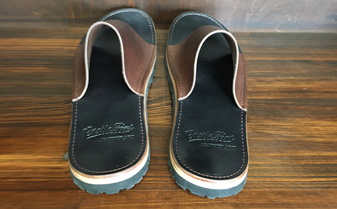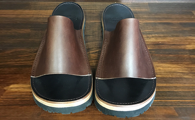 当社ロゴ入りのレザーサンダルです。裁断、床面処理、縫製(手縫い)まで、1つ1つ妥協せず丁寧に手作りしています。使い込むほど、なじんできますので、自分だけの風合いを楽しめます。牛革使用で使うほどに味が出ます。