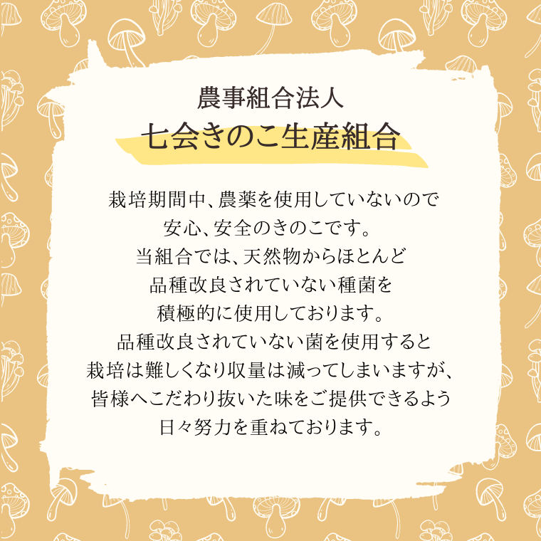 栽培期間中農薬を使用していないので安心、安全のきのこです。