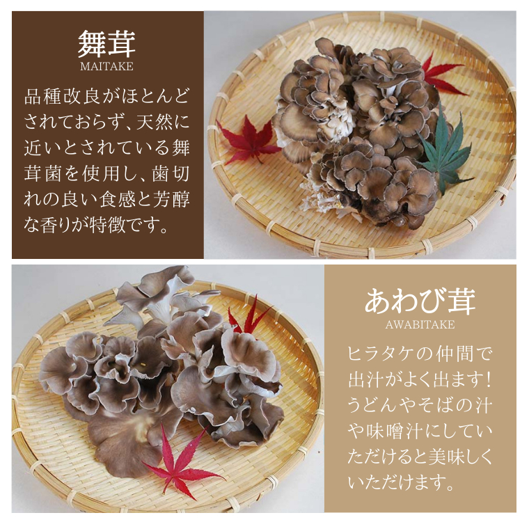 【舞茸】品種改良がほとんどされておらず、天然に近いとされている舞茸菌を使用し、歯切れの良い食感と芳醇な香りが特徴です。