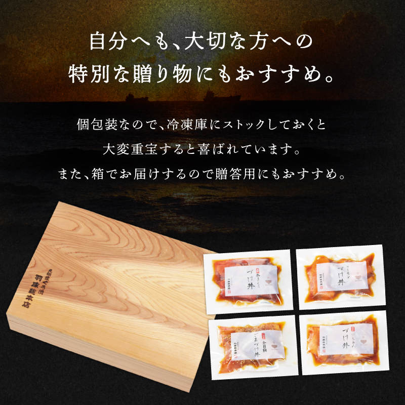 天然本まぐろ、三崎産黒潮金目鯛、サーモン、びんとろをこだわりの自家製タレに漬け込みました。