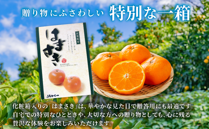 佐賀県で丁寧に育てられた「はまさき」は、12.5度以上にも及ぶ高い糖度とジューシーさ、甘い香りが楽しめる贅沢な柑橘です。