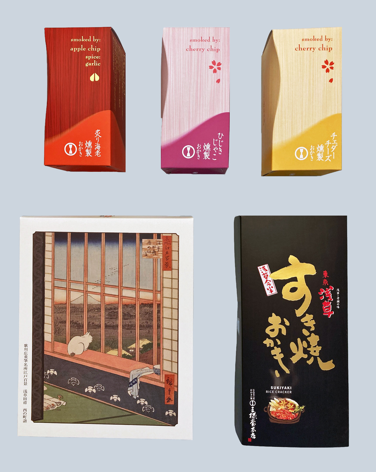 (5種類すべての商品が、主原料のもち米は国産もち米を使用しています。また、昔かきもち・海日和山日和は、パッケージに歌川広重の版画を印刷したバージョン品です。)