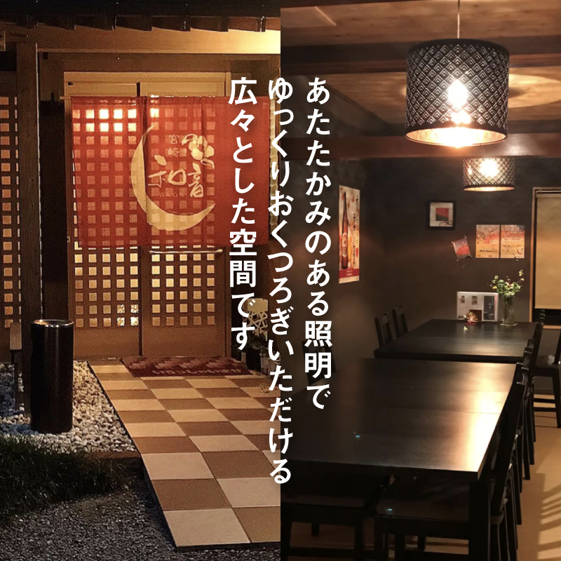 個室6、広間6のテーブル席、一部屋が広々とし、照明はあたたかみのある間接照明でゆっくりおくつろぎいただける空間をご用意しております。
