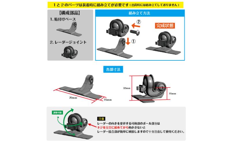 ※レーダーの向きを変更する可動部分のボール部分はネジを完全に緩めてから動かさないと、接合部が簡単に折れてしまいます。接合部箇所だけの破損は保証ない為、操作には十分注意して使用ください。
