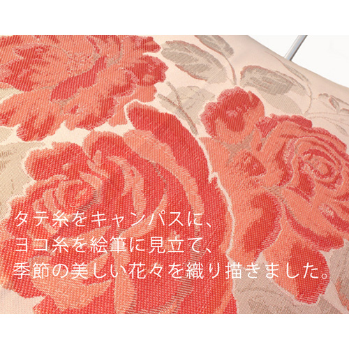 タテ糸をキャンバスに、ヨコ糸を絵筆に見立て、季節の美しい花々を織り描きました。傘に大きく咲き誇る華麗な花たちは、ダイナミックさと繊細さを兼ね備え、見る人の心を惹きつけます。花束を思わせるデザインは、織物ならではの高級感とも相まって、贈り物にも最適な1本です。お好みの花や、時期に合わせてコーディネートを楽しむこともできます。夏にはもちろん、実は1年を通してご注文をいただくほど、シリーズの中で最も人気の柄です。本物の向日葵のように、多くの人の心を明るく、元気にしてくれます。