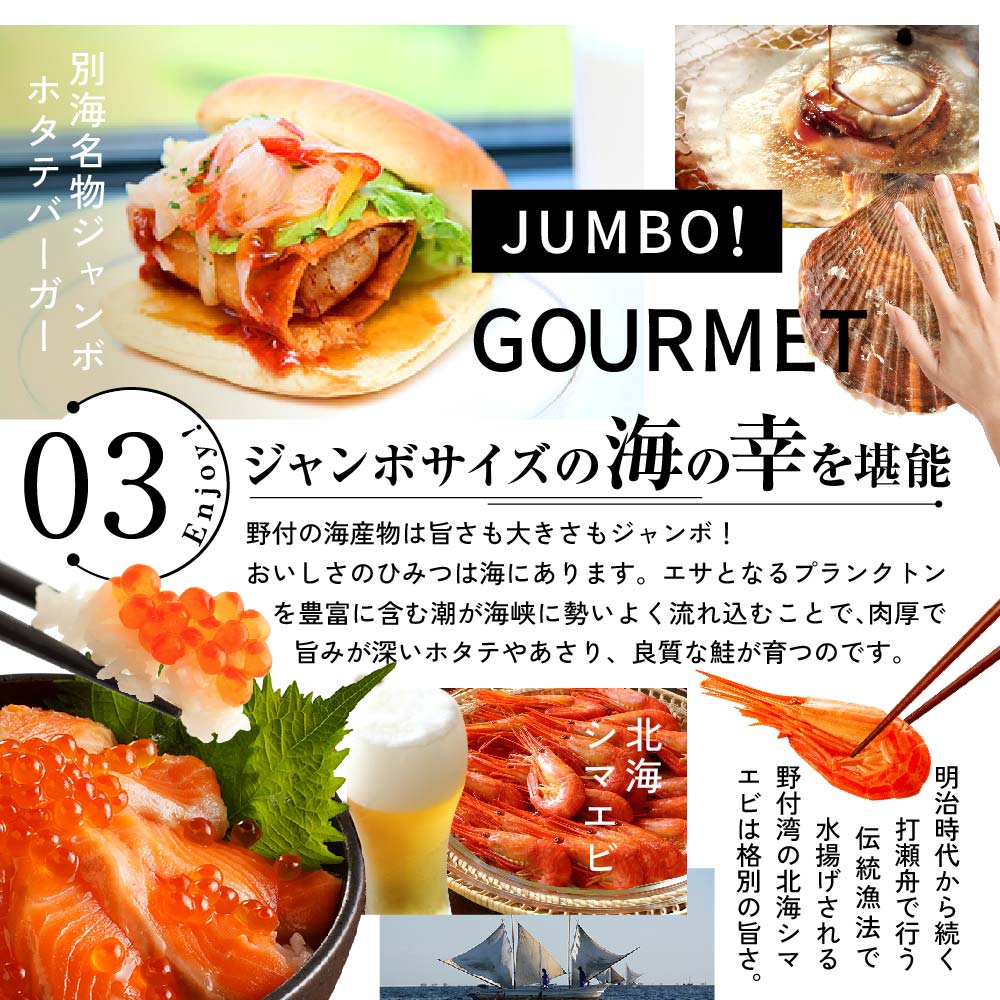 別海町の野付で獲れる海産物は大きさがジャンボ。魚介類の餌となるプランクトンを豊富に含む海流が流れ込み肉厚で旨味が深いホタテやアサリ、良質な鮭が育ちます。明治時代から続く打瀬舟で行う伝統漁方で水揚げされる野付湾の北海シマエビは希少性があり格別の美味しさです。