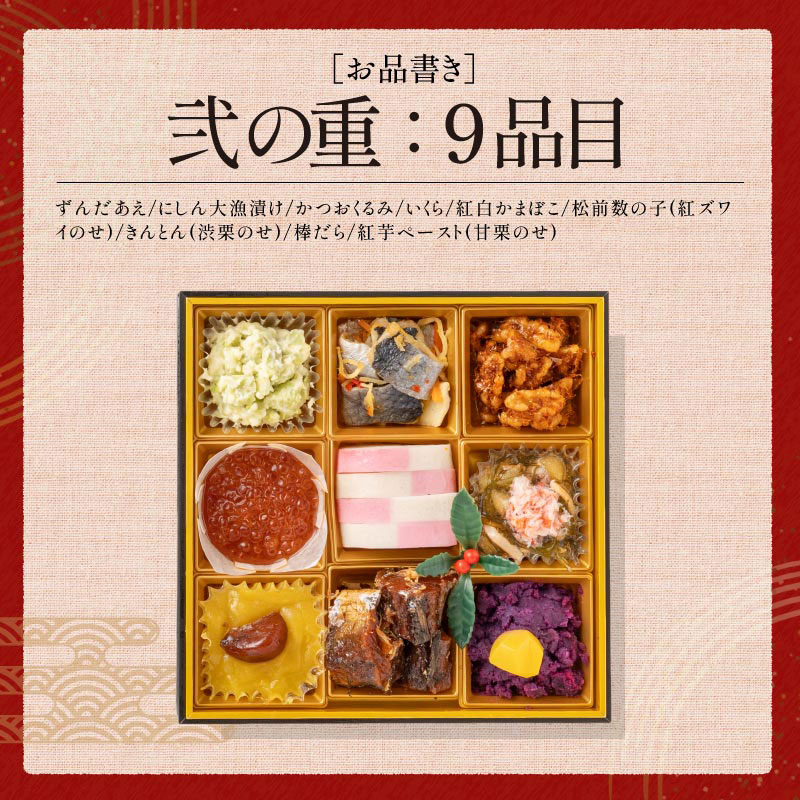 ずんだあえ、にしん大漁漬け、かつおくるみ、いくら、紅白かまぼこ、松前数の子(紅ズワイのせ)、紅ズワイ、きんとん(渋栗のせ)、渋栗、棒だら、紅芋ペースト(甘栗のせ)、甘栗
