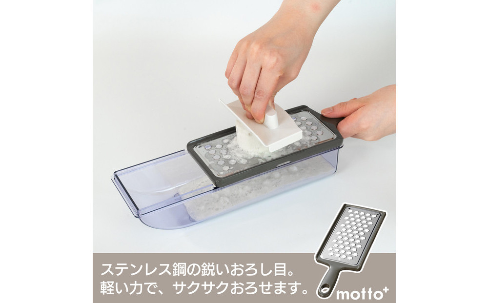 材質:本体(収納ケース)/ABS樹脂、蓋/AS樹脂、安全ホルダー/ポリプロピレン樹脂、本体(プレート)/ABS樹脂、刃部/ステンレス鋼、ピーラー/ポリプロピレン樹脂、刃部/ステンレス鋼