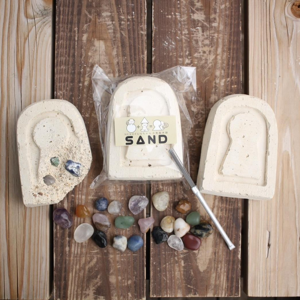 付属のヤスリで少しずつ削って原石を掘り出し、出てきた原石を水で洗い、小さなお子様が誤飲しないよう保管してください。予期せぬトラブル防止の為、必ず6歳以上保護者様同伴で正しくお遊び下さい。
