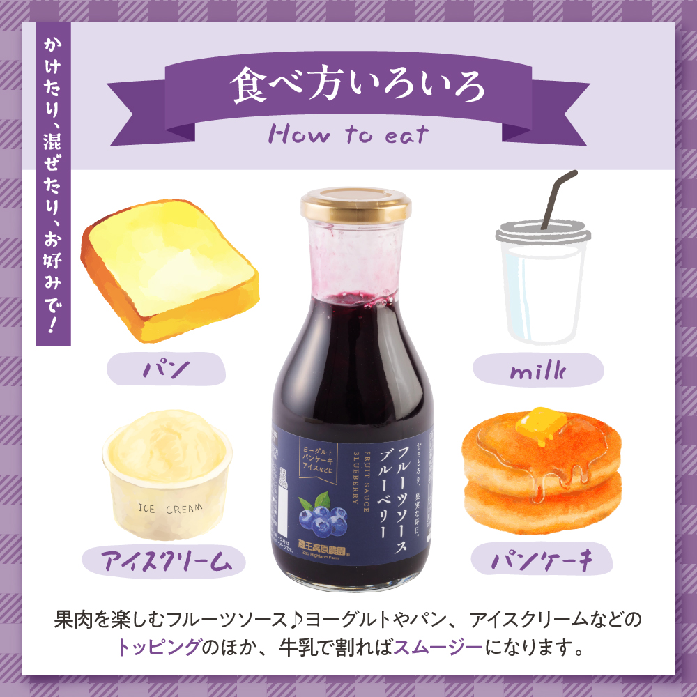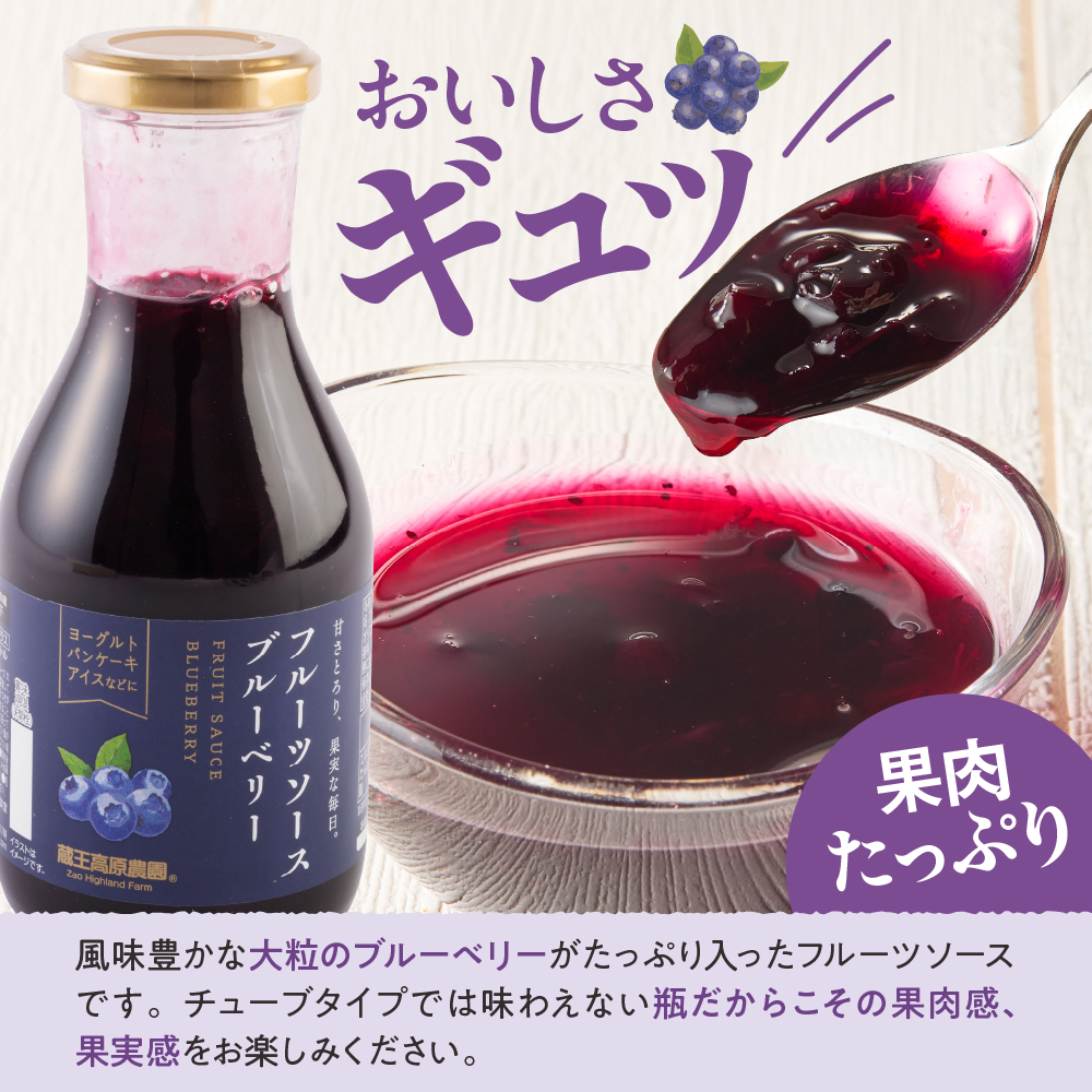 風味豊かな大粒のブルーベリーがたっぷり入ったフルーツソースです。チューブタイプでは味わえない瓶だからこその果肉感、果実感をお楽しみください。