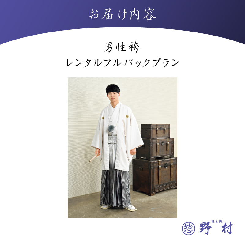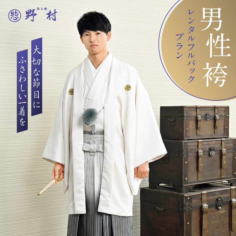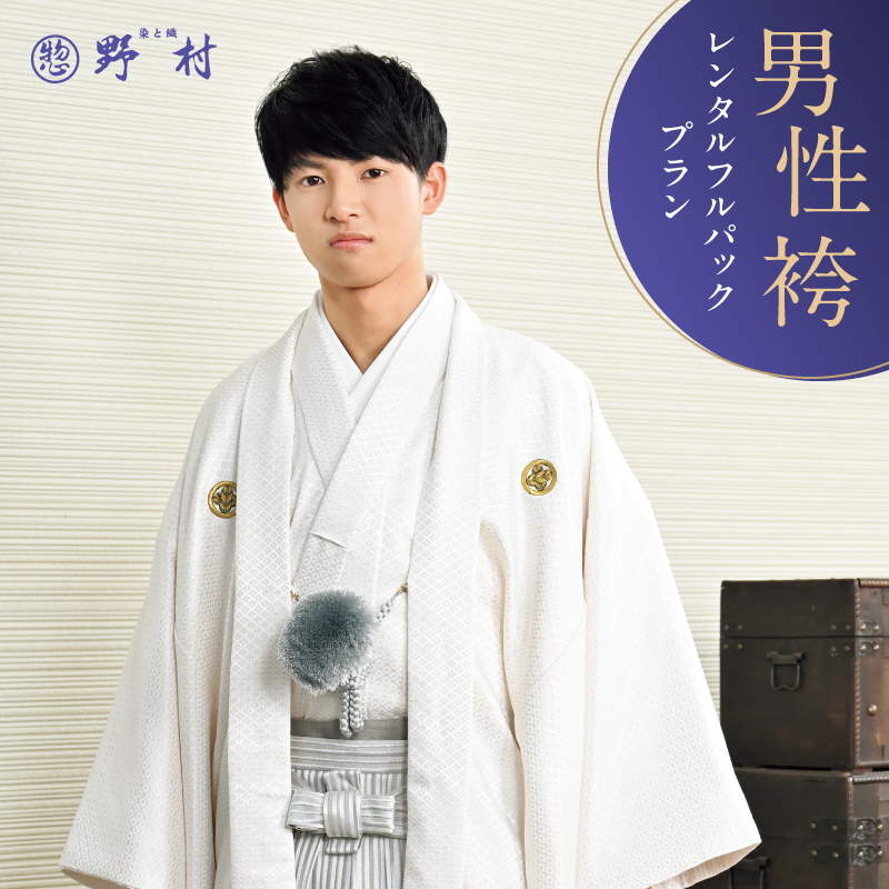 「男性袴レンタルフルパックプラン」は、男性用の袴・着物・小物・着付けがすべて揃う便利なセットです。