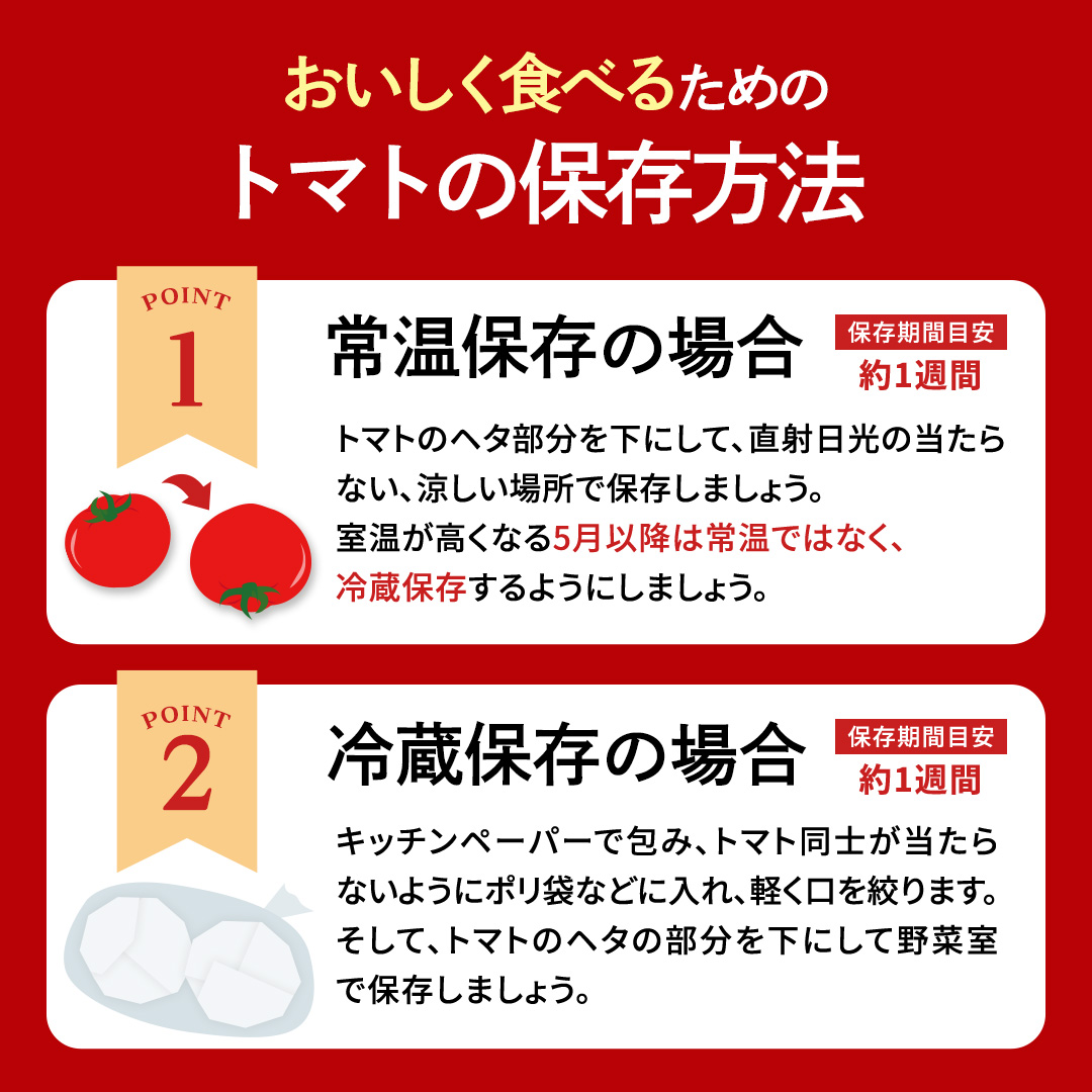 トマトは追熟してお楽しみいただけます。追熟させることで、果肉が柔らかくなり酸味が抜けて甘みが強くなります。追熟させる際には、直射日光の当たらない風通しのよい場所で常温で保管ください。追熟するにつれ赤みが濃くなってきます。冷蔵庫に入れると追熟が止まります。