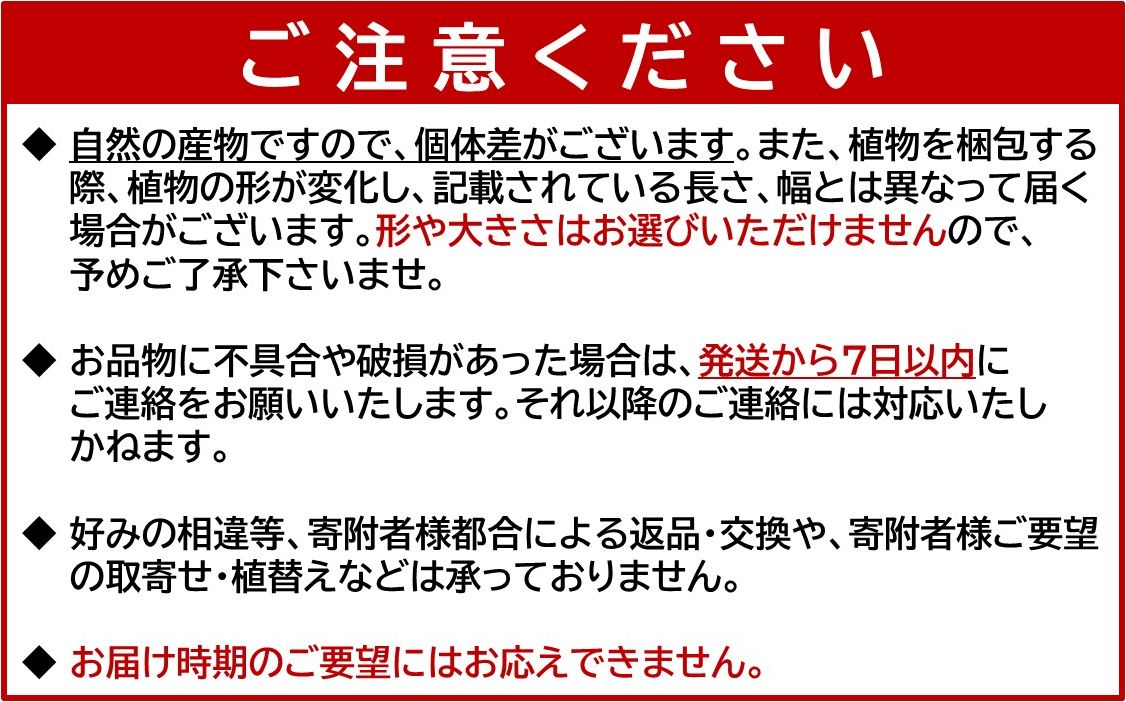 また、植物を梱包する際、枝や葉など抑えこむため、植物の形が変化し、記載されている長さ、幅とは異なって届く場合がございます。